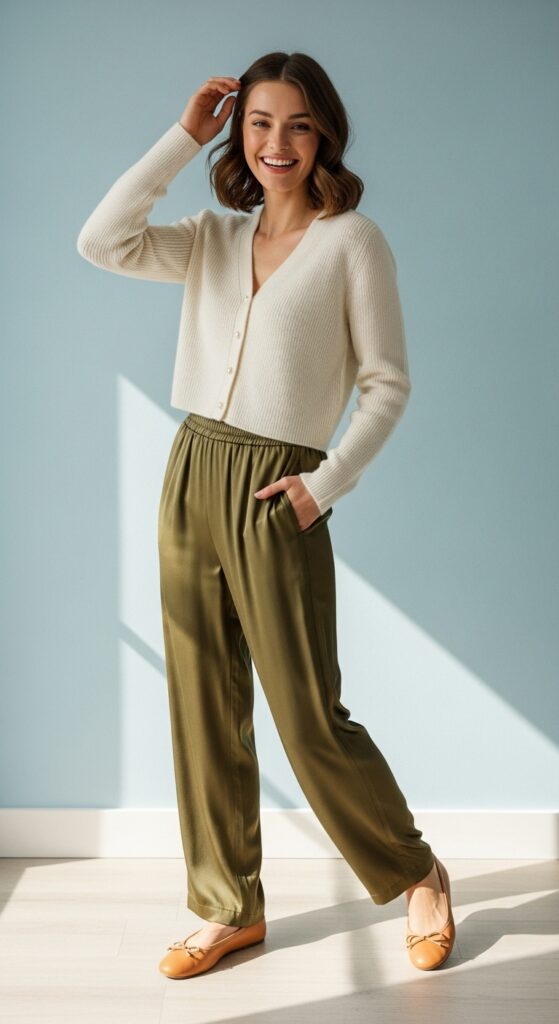 Here’s where things get a little playful. A cropped cardigan adds that soft, feminine energy to silk trousers without making the look feel too serious. Think cozy meets elegant in the best possible way.