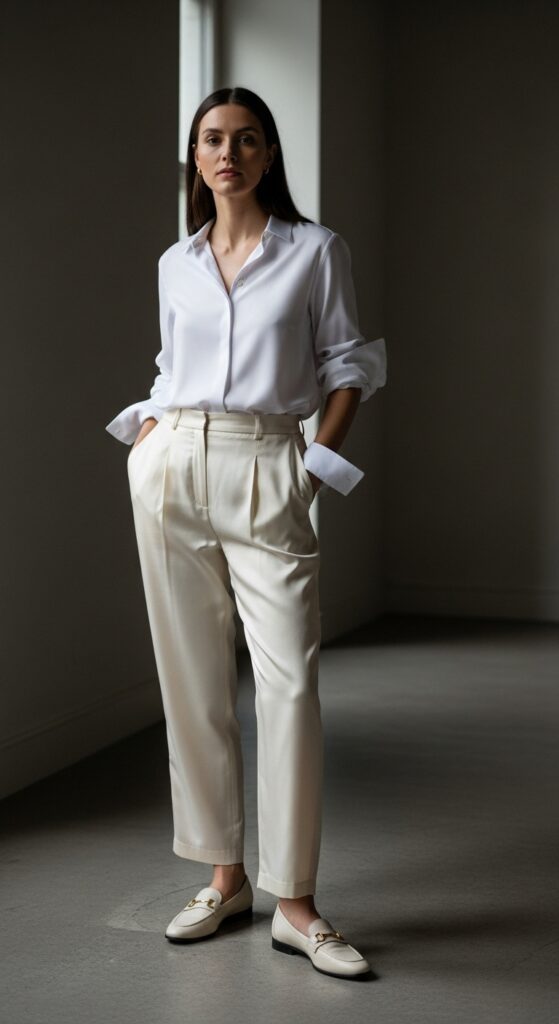 Leave a couple buttons undone for a relaxed feel, or tuck it in completely for a more tailored appearance. Roll the sleeves slightly for that “I styled this in two seconds” energy. Add loafers or kitten heels depending on the occasion. This elegant styling choice works in literally any setting, any season, any mood.