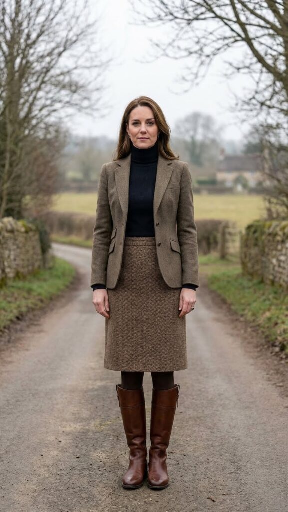 When you’re looking for an outfit that channels timeless British countryside charm, a tweed skirt paired with classic riding boots delivers effortless sophistication.