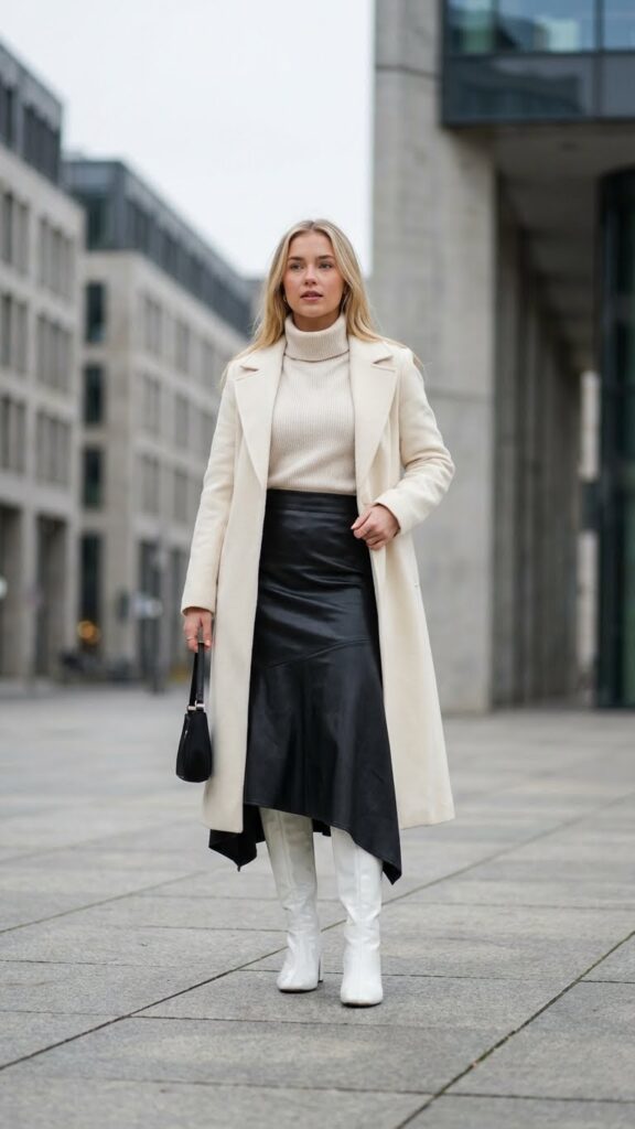 A faux leather midi skirt paired with white go-go boots creates a bold retro-modern statement that’ll turn heads this winter season.