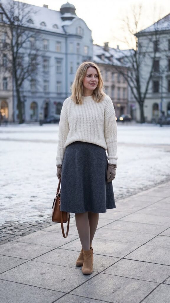 When temperatures drop, wool A-line skirts paired with suede ankle boots create a timeless winter combination that’s both sophisticated and practical.