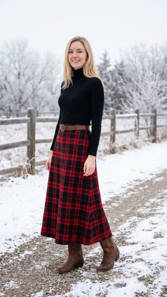 A plaid maxi skirt paired with western cowboy boots creates a cozy, rustic aesthetic that’s perfect for winter’s colder months. This combination gives you the freedom to express your unique style while staying warm and comfortable.