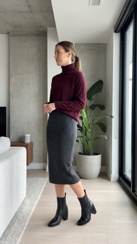 Choose a midi-length knit skirt that hits just below your knee for ideal warmth and style. The elastic waistband gives you freedom to move comfortably throughout your day. Heeled Chelsea boots add height and elongate your legs without sacrificing stability on winter sidewalks.