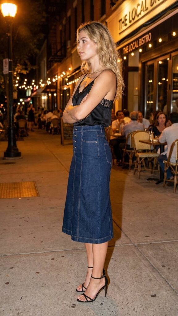 Denim skirts aren’t just for brunch anymore. A structured denim midi with a delicate lace camisole is unexpectedly perfect for dinner. The casual cool of denim paired with the romance of lace creates this effortlessly chic contrast that looks intentional without being try hard.