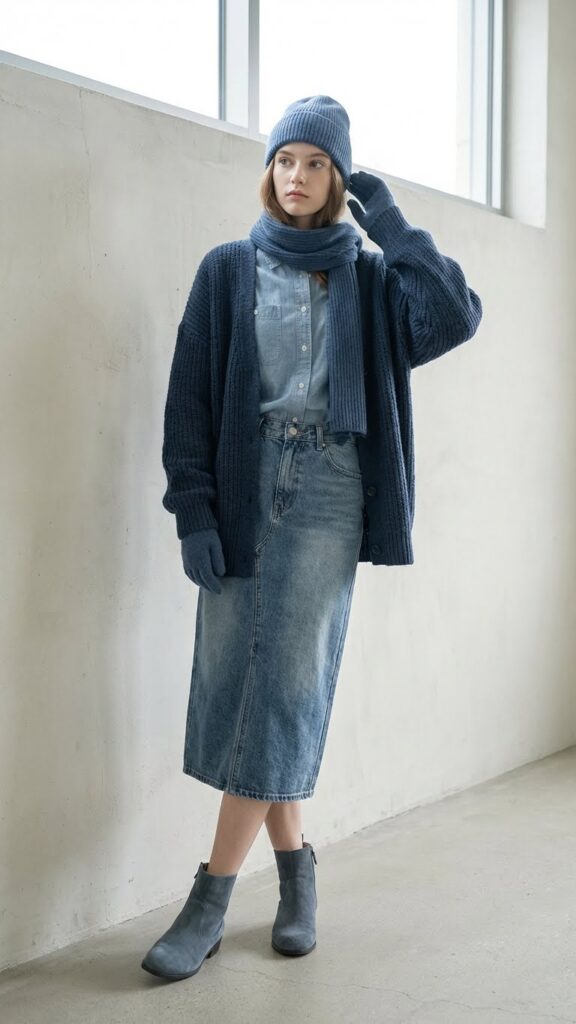 When you’re craving a streamlined look that’s effortlessly chic, monochrome denim paired with cozy layers delivers stunning results. Start with a medium-wash denim skirt and match it with a chambray shirt in a similar shade. Add a chunky knit sweater in coordinating blue tones for warmth and visual interest.