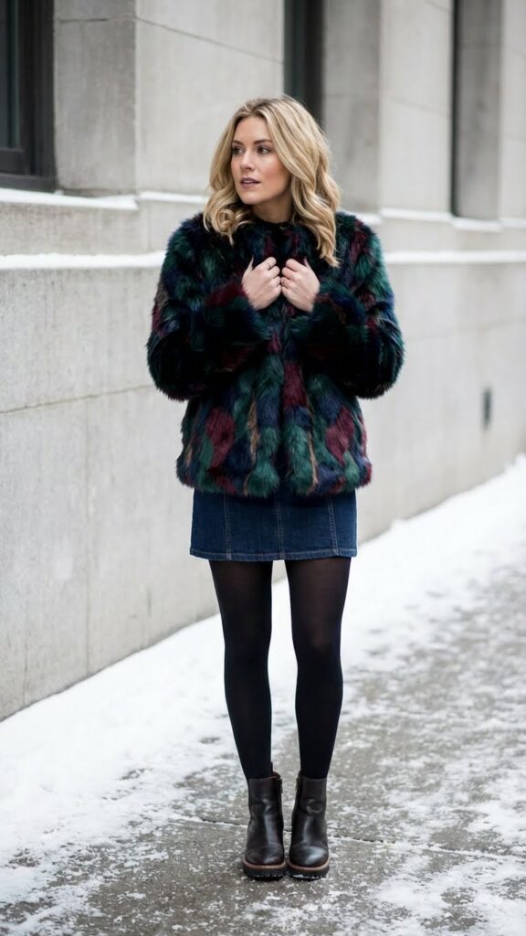 Faux fur coats instantly modify your jean skirt outfit into a head-turning winter ensemble that commands attention. You’ll love how dramatic faux fur accents alter even the simplest denim piece into something extraordinary. Choose bold colors like emerald or burgundy to express your independent spirit.