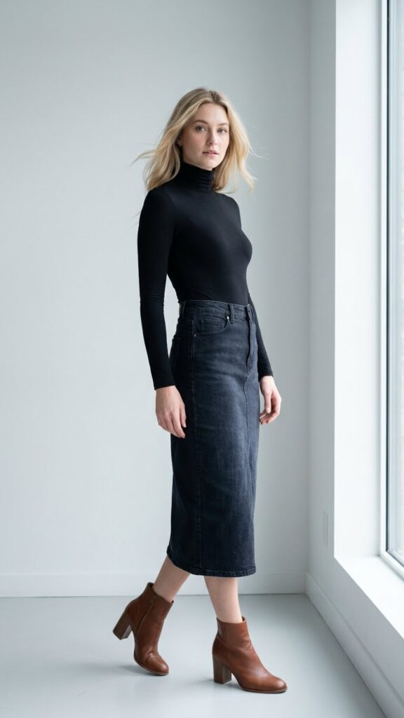 A fitted mock neck top paired with heeled boots creates a sleek silhouette that’s perfect for winter jean skirt outfits. This combination gives you the freedom to move confidently while looking polished and put-together.
