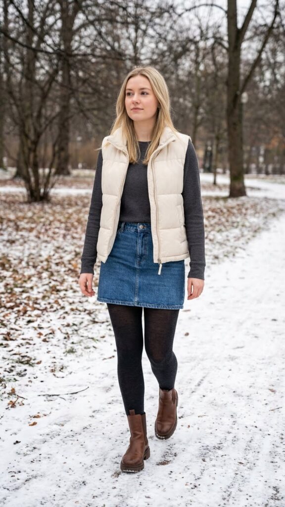 Choose a faux leather vest for an edgier vibe that pairs beautifully with darker denim skirts. The sleek material adds sophisticated texture while maintaining that laid-back energy you’re after. For a sportier look, opt for a classic nylon puffer in neutral tones like black, cream, or olive. Layered looks with a jeans skirt can create a casual yet stylish winter outfit.