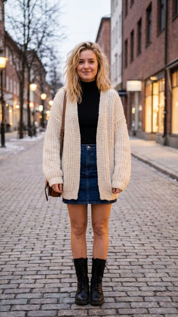Choose cozy textures like cable-knit or bouclé cardigans that drape beautifully over your denim skirt. Layer a fitted turtleneck underneath for extra warmth without adding bulk. Your combat boots should hit mid-calf to complement the skirt’s hemline.