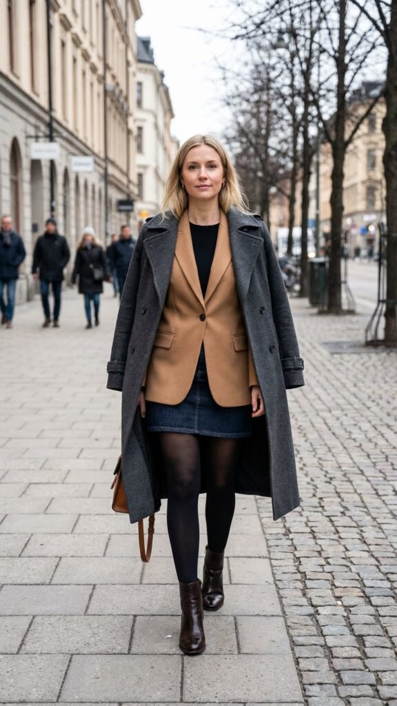 Layering a structured blazer beneath your wool coat creates a polished, sophisticated look that’s perfect for jeans skirt outfits in colder months. This layered look gives you the freedom to adapt throughout your day, removing your coat indoors while still looking put-together.