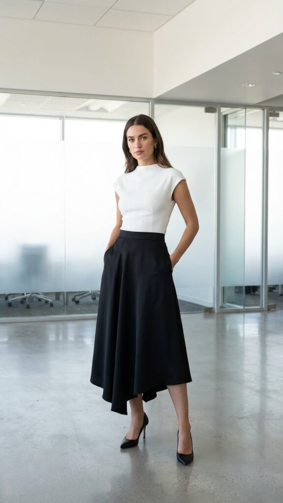 When you’re ready to add modern flair to your office wardrobe, asymmetrical skirts paired with clean-line tops create a striking balance between contemporary style and workplace appropriateness. The asymmetrical silhouette brings visual interest without compromising professionalism, especially when you choose midi-length styles that maintain coverage.