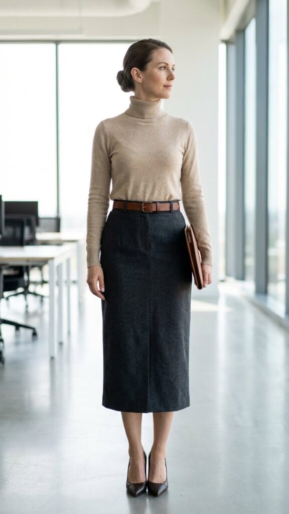 Skip the oversized blazer pairing here—fitted cuts define your waist and maintain proportional harmony. This combination offers incredible skirt length versatility, allowing you to experiment with different hemlines while staying workplace-appropriate.