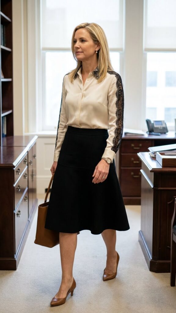 Choose a pencil or A-line black skirt in ponte or wool fabric for structure and polish. Select a lace detail blouse with subtle patterns around the neckline, sleeves, or hem to maintain office appropriate standards. Cream, white, or soft blush tones work beautifully against black.