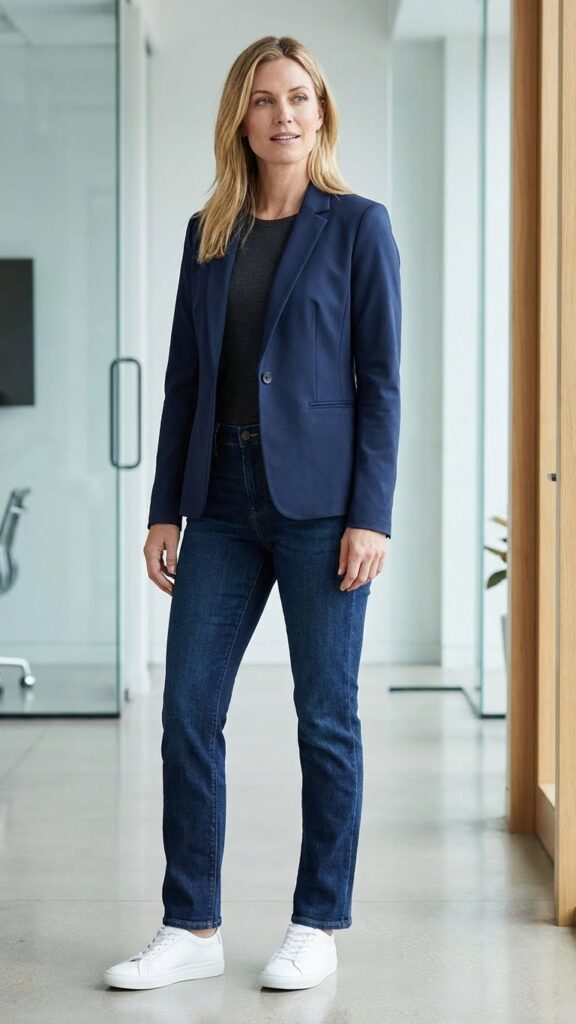 Dark denim provides the perfect casual counterbalance to your structured blazer, creating visual interest without compromising professionalism. Complete this versatile look with layered accessories like a sleek watch and leather crossbody bag. This combination gives you freedom to move confidently through meetings while projecting authority and style in any modern workplace setting.