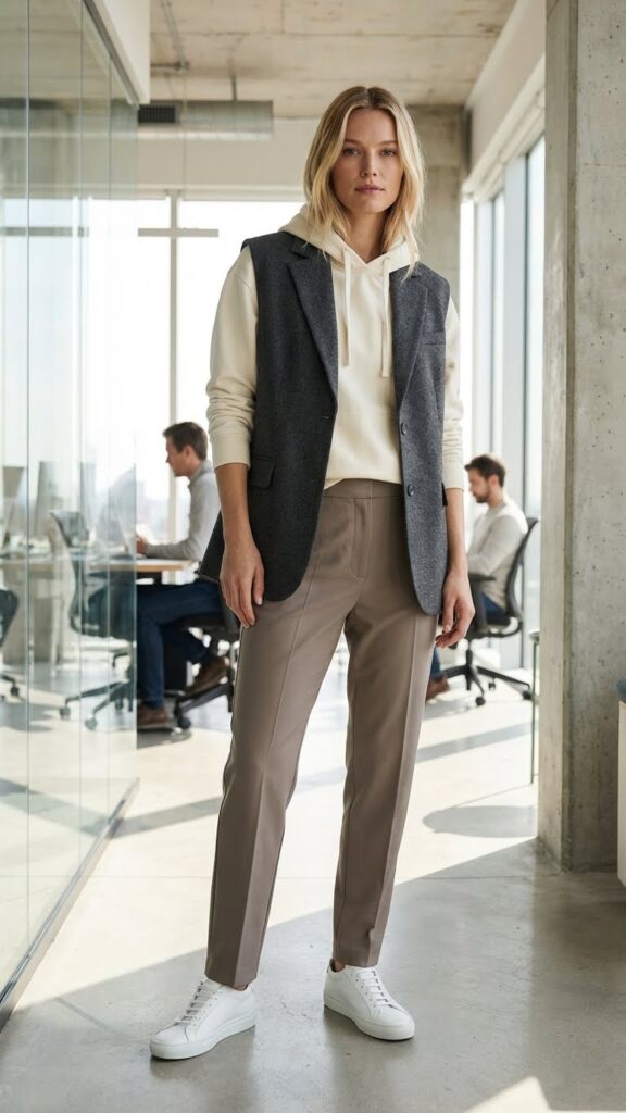 The unexpected combination of a cozy hoodie tucked beneath a customized vest creates a perfectly balanced look that merges athletic comfort with professional structure. You’ll break traditional office boundaries while maintaining workplace appropriateness through this innovative layering technique.