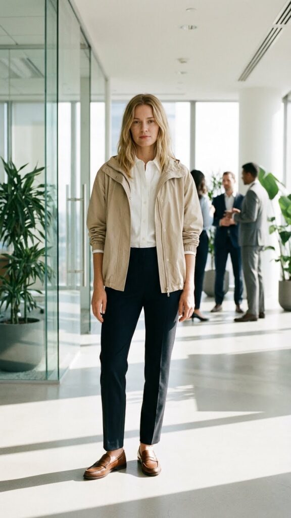 Opt for streamlined windbreakers in technical fabrics that resist wrinkles and maintain their shape throughout your workday. This combination lets you move freely while projecting confidence and modern style in any office environment.