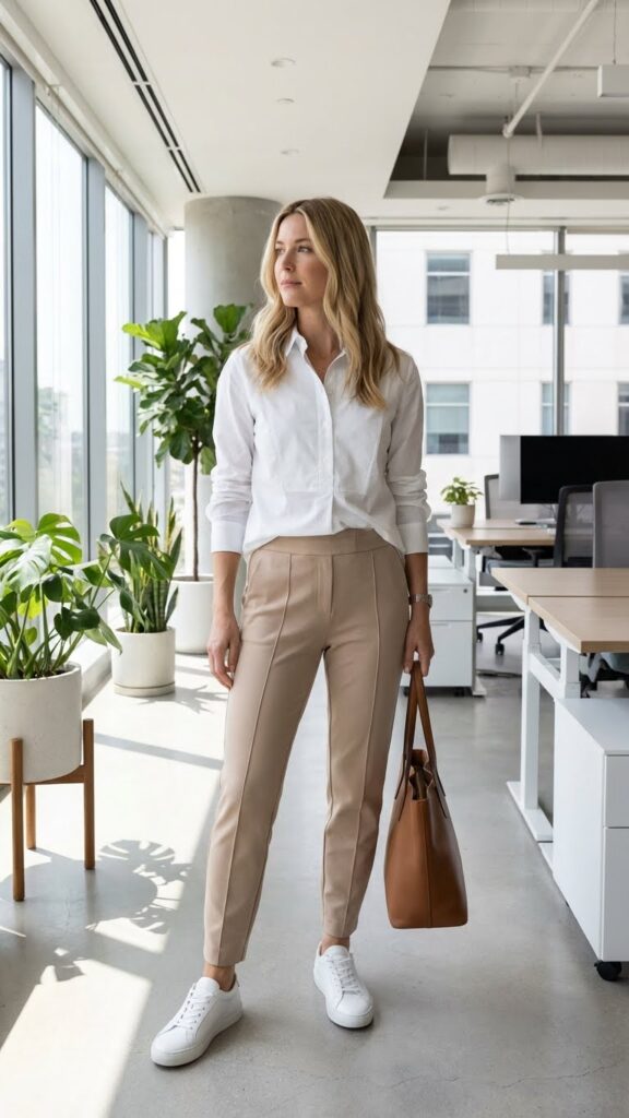 Choose a monochrome palette like navy, gray, or beige to maintain professionalism while adding unexpected athletic elements. Your sneakers should be pristine and minimalist—think leather or canvas styles without bold logos. This combination works perfectly for casual Fridays or creative workplaces where you can express personality while staying polished and comfortable throughout your workday. These relaxed workday looks offer the perfect blend of style and comfort for modern office environments.