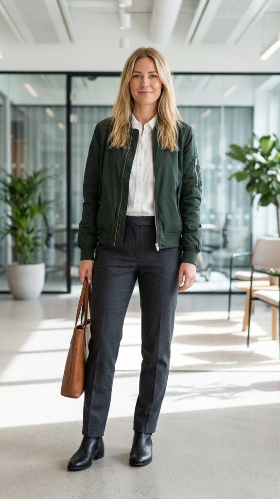 When you need to amplify your sporty office look beyond basic combinations, a bomber jacket metamorphoses your crisp white collared shirt into a contemporary statement piece. This pairing breaks traditional workplace boundaries while maintaining professional credibility through strategic styling choices.