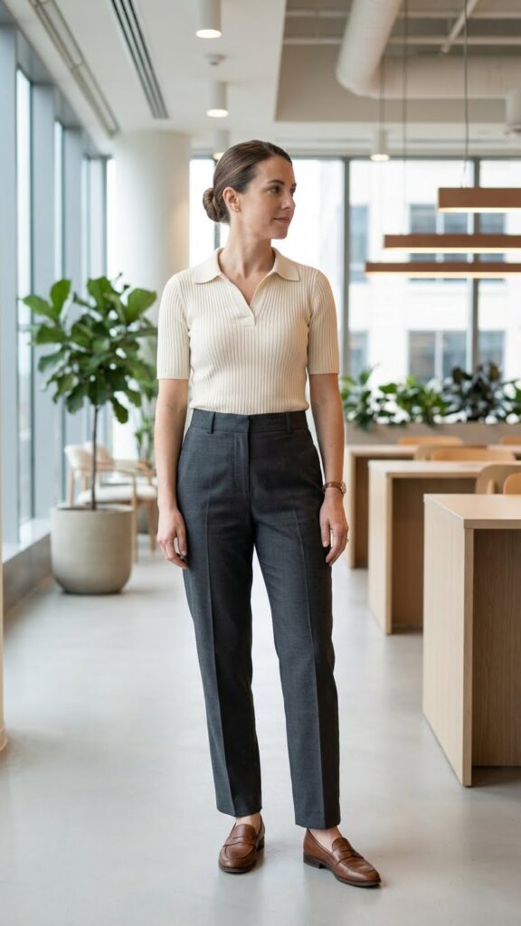 This combination delivers freedom of movement while projecting competence and style in modern office environments. These versatile office outfits work particularly well for maintaining both comfort and professionalism throughout your workday.