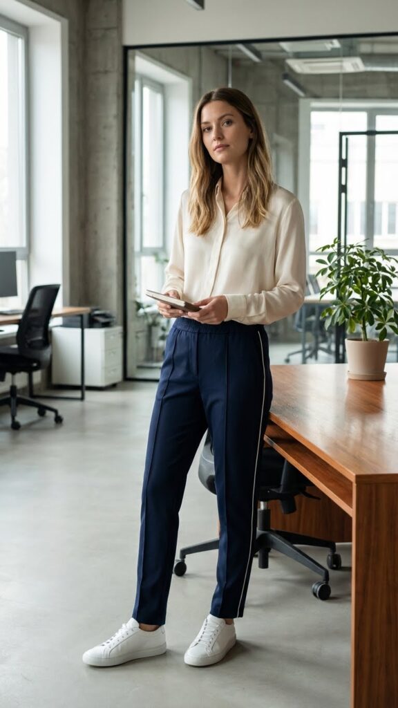 Choose track pants with metallic accents along seams or zippers for subtle visual interest. The satin textures of your silk top will complement the structured fabric beautifully. Complete the look with comfortable Converse sneakers that maintain the sporty aesthetic while providing all-day comfort for busy office days. Opt for neutral colors like navy, charcoal, or cream to guarantee versatility across multiple office occasions.