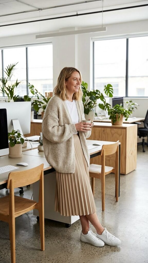 Clean white sneakers revitalize the traditional midi skirt and cardigan combination into a rejuvenating modern office ensemble that balances comfort with sophisticated style. You’ll create visual interest by pairing a crisp pleated skirt with an oversized cardigan in complementary textures.