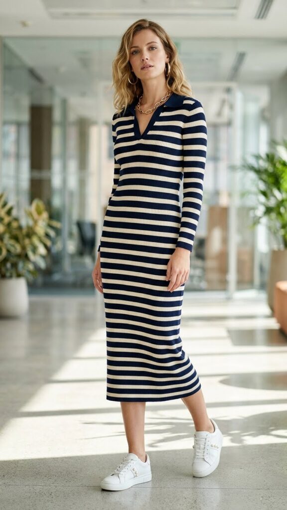When you want to merge athletic comfort with workplace sophistication, a sporty knit dress becomes your perfect foundation for creating polished office looks. Choose a midi-length knit dress in neutral tones like charcoal or navy for maximum versatility.