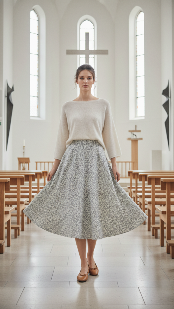 Mix patterns and textures by selecting a textured knit sweater with a solid skirt, or try a subtle patterned skirt with a classic crew neck. This combination creates graceful church outfits that maintain appropriate modesty while expressing your personal style. Complete the look with comfortable flats or low heels for an effortlessly polished appearance.