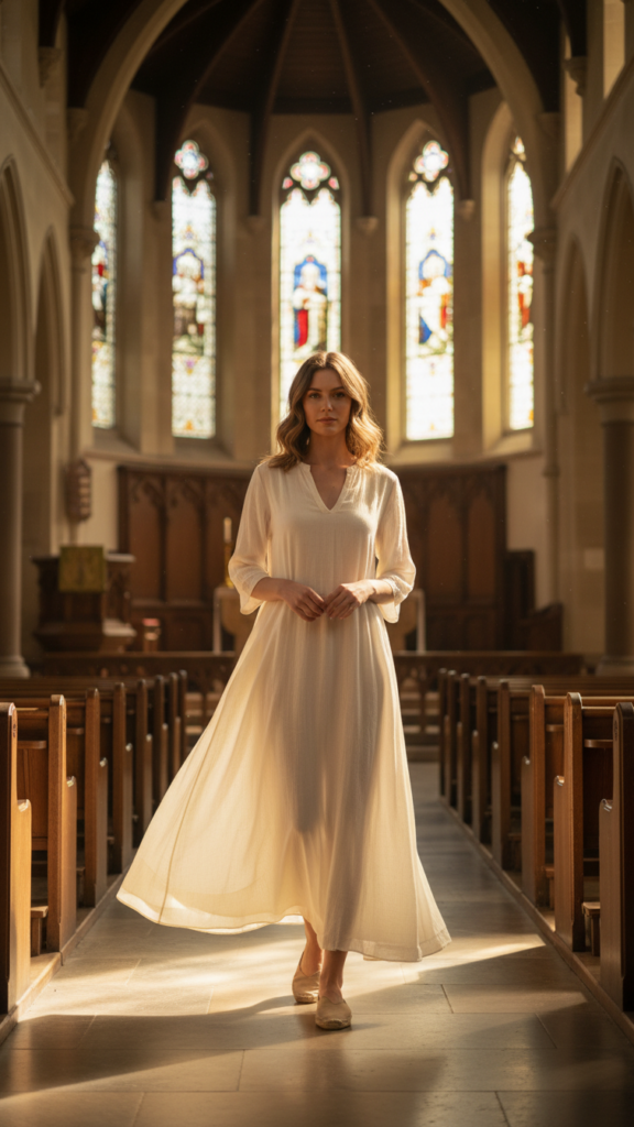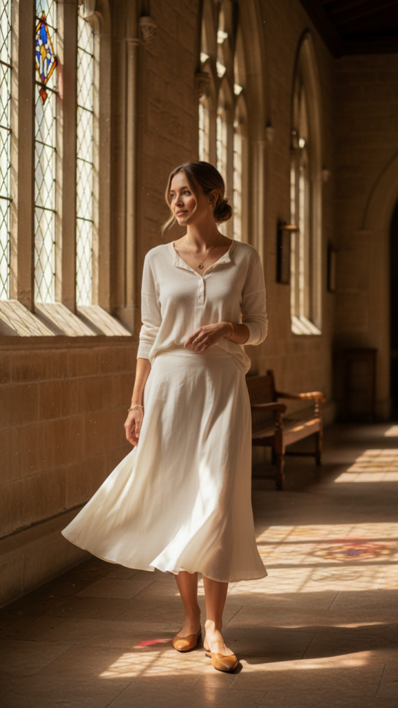 Accessorize thoughtfully with simple jewelry and comfortable flats or low heels. This combination lets you move freely while respecting the church setting beautifully.