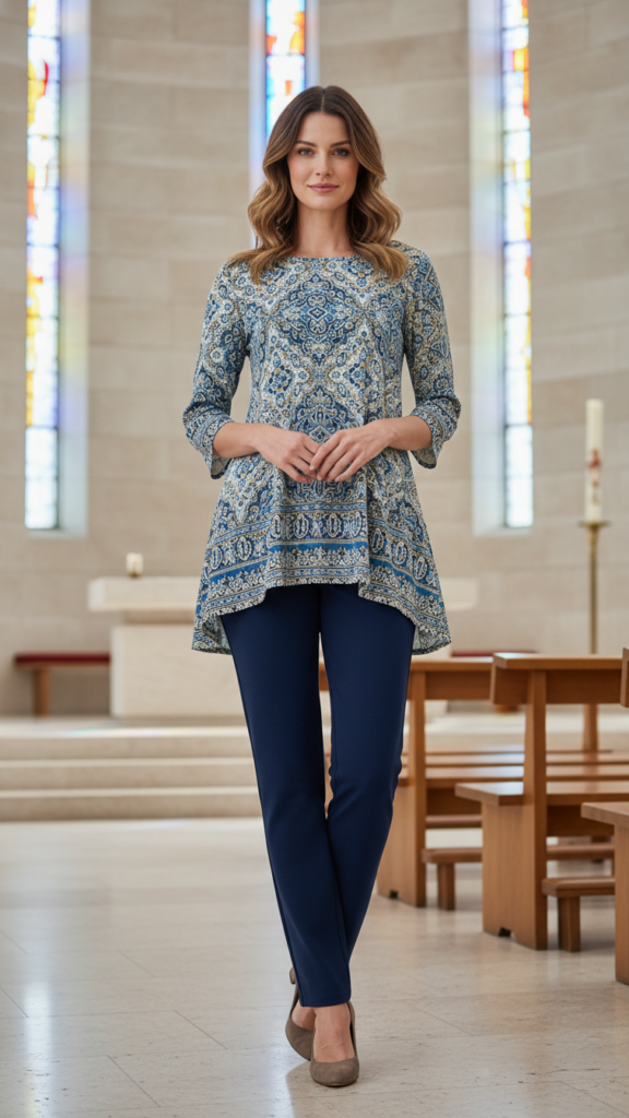 When you’re looking for comfort without sacrificing style, ponte pants paired with a tunic top create the perfect Sunday church ensemble. This combination offers flexibility while maintaining an appropriate appearance for worship services.