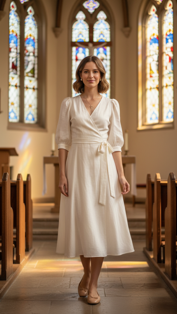 Choose three-quarter or full sleeve length options for added modesty and seasonal versatility. The wrap dress silhouette naturally creates a feminine waistline without restrictive fitting, allowing comfortable movement during standing and sitting. White dresses offer particularly chic and elegant styling that feels both fresh and sophisticated for church settings.