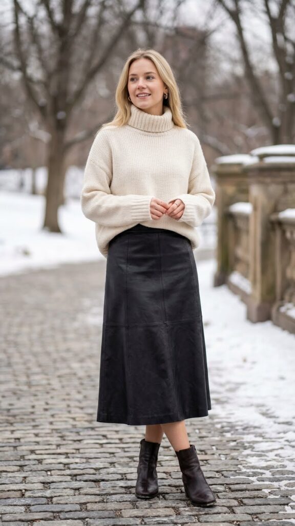 Choose an oversized cream or camel turtleneck for a relaxed vibe that doesn’t restrict your movement. Pair it with a black or burgundy leather midi skirt that hits below the knee. Complete this outfit with ankle boots and minimal gold jewelry. You’ll feel confident and unrestricted all day long.