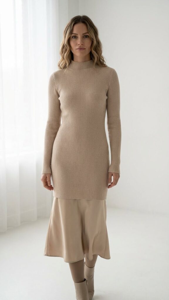 A mock neck sweater dress layered over a longer skirt creates an unexpectedly chic silhouette that’s gaining popularity this winter season. This cozy and stylish combination lets you experiment with lengths, textures, and proportions in fresh ways.