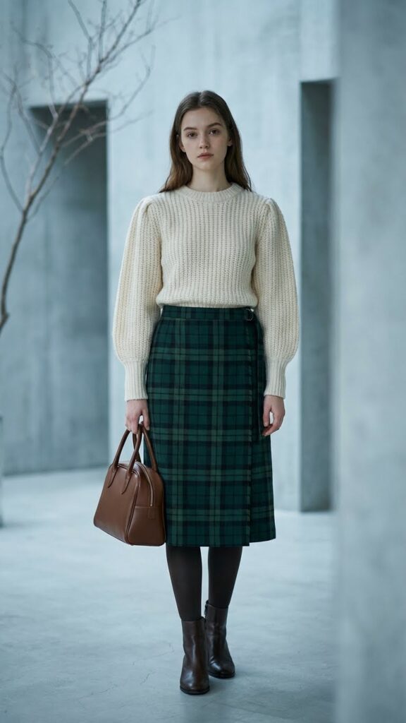 Puff sleeve sweaters paired with plaid wrap skirts offer one of the most flattering combinations you’ll find this winter season. The dramatic puff sleeves create beautiful shoulder definition while drawing the eye upward toward your face. This silhouette works wonderfully for creating an hourglass shape that feels both polished and comfortable.
