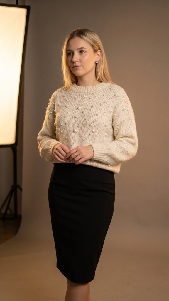For cold weather styling, choose a sweater with subtle sparkle around the neckline or scattered throughout the fabric. A black pencil skirt offers sophisticated balance, while an A-line silhouette gives you more movement and freedom.