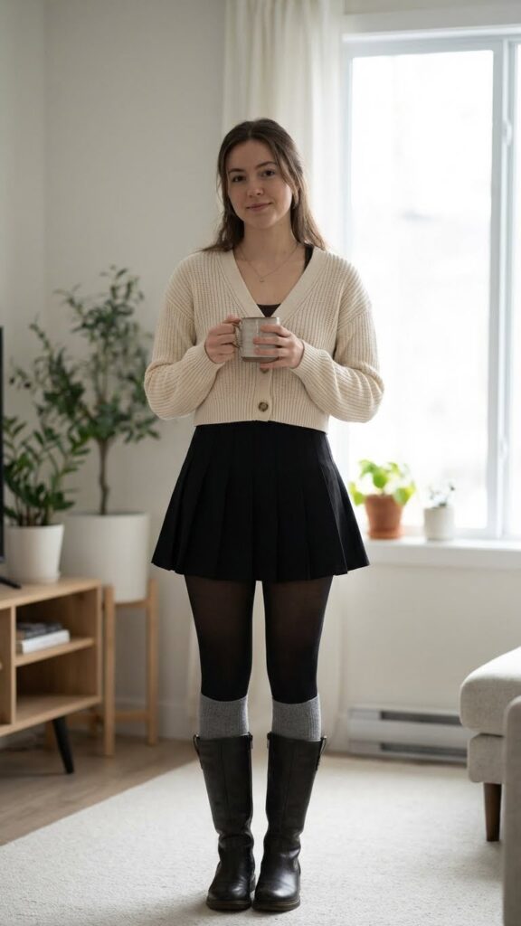 Although mini skirts might seem impractical for colder months, adding tights alters this playful piece into a winter-ready staple. A cropped cardigan pairs beautifully with a pleated mini, creating a balanced silhouette that’s both chic and functional. You’ll love how this combination lets you express your personal style without sacrificing warmth.