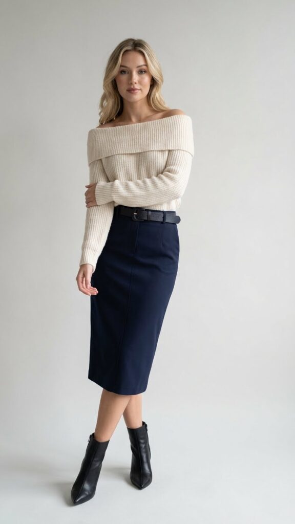 Stepping into an off-the-shoulder sweater paired with a pencil skirt instantly enhances your winter wardrobe with sophisticated charm. This combination lets you express your personal style while maintaining elegance throughout the colder months.