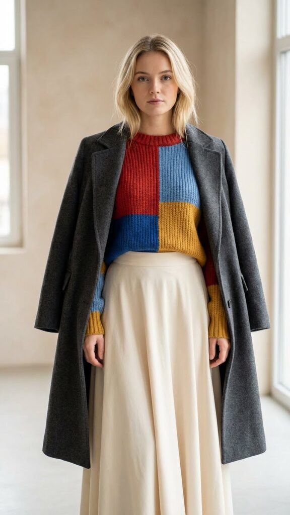 Layered aesthetics work beautifully here—add a structured coat that picks up one of your sweater’s accent colors. This approach ties everything together seamlessly.