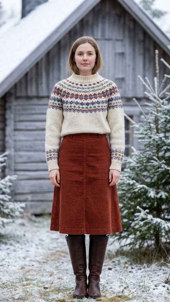 Choose an A-line corduroy skirt in earthy tones like rust, olive, or camel to complement traditional Fair Isle colors. Complete your look with knee-high boots and wool tights. This outfit gives you freedom to move comfortably while maintaining polished winter style.