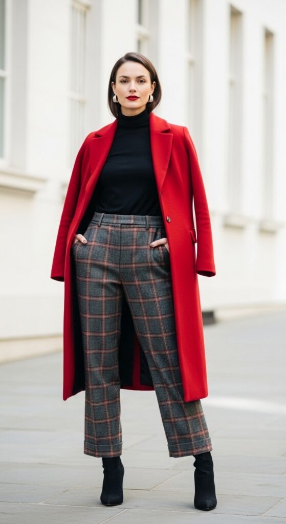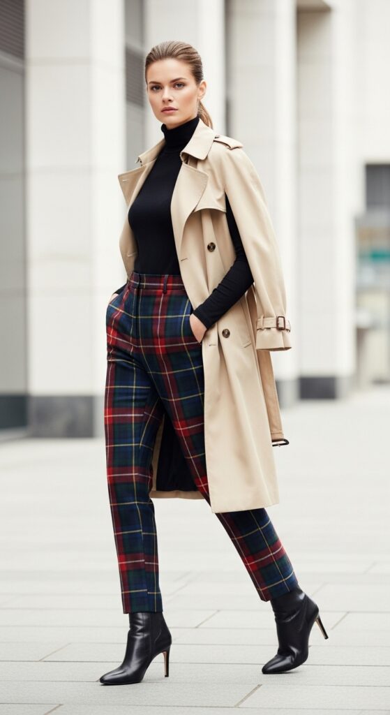Underneath, keep it simple with a black turtleneck or neutral sweater. The tartan trousers bridge the gap between your basic top and statement coat, creating a cohesive outfit that looks intentional. It’s like the middle child that keeps the family together.