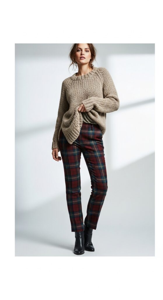 The beauty of this combo is the texture play. You’ve got the softness of the knit against the structured pattern of the tartan, and it just works. Add ankle boots, and suddenly you’re that person everyone wants style advice from.