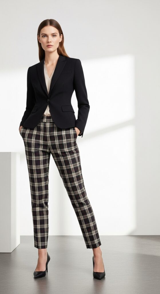 Different from the oversized blazer vibe, this is about sharp, tailored precision. A fitted blazer in a solid color (black, navy, camel) paired with tartan trousers creates a look that’s polished and professional but still has personality.