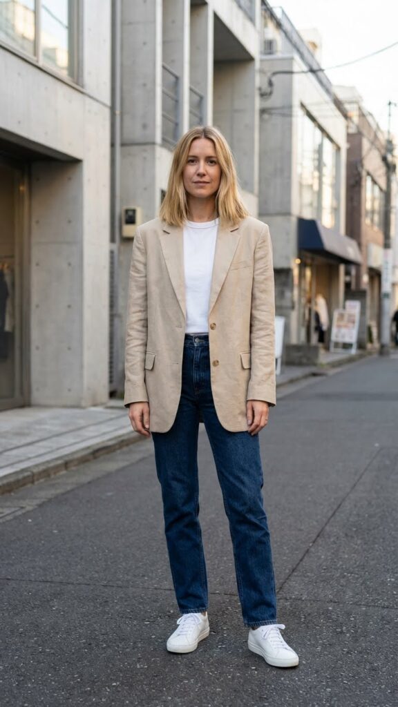 Throw on some white sneakers or chunky loafers underneath, and you’ve got a look that works for everything from coffee shops in Shimokitazawa to fancy sushi dinners in Ginza. Add a simple white tee or tank underneath the blazer and a crossbody bag to keep your hands free for taking a million photos. This outfit screams “I have my life together” even if you’re just winging your Tokyo itinerary.