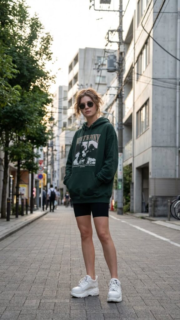Athleisure done the Tokyo way means looking sporty without actually working out. An oversized hoodie paired with bike shorts creates that perfect casual, youthful vibe that’s comfortable enough for a full day of sightseeing.
