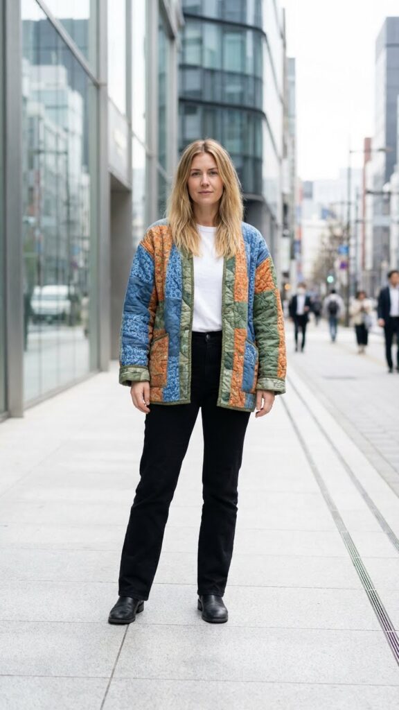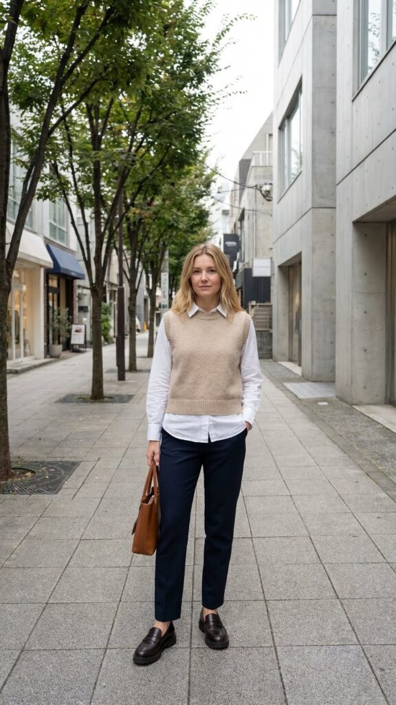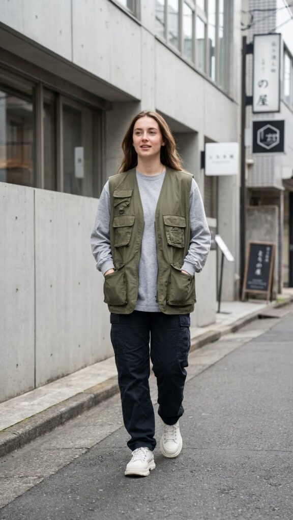 Layer one over a long-sleeve tee and pair with cargo pants or straight-leg jeans for maximum functional fashion energy. The vest adds visual interest and gives you actual useful pockets for your phone, transit card, and snacks. Style it with minimal jewelry and let the vest be the statement. Combat boots or chunky sneakers complete the look. It’s practical, it’s cool, and you’ll feel like you could navigate the Tokyo subway system with your eyes closed.