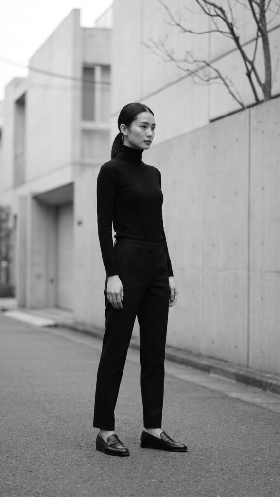 All black everything isn’t boring when you do it the Tokyo way. The secret is playing with textures and silhouettes rather than relying on color for interest. Think a black ribbed turtleneck tucked into high-waisted black trousers, finished with black leather loafers or ankle boots.