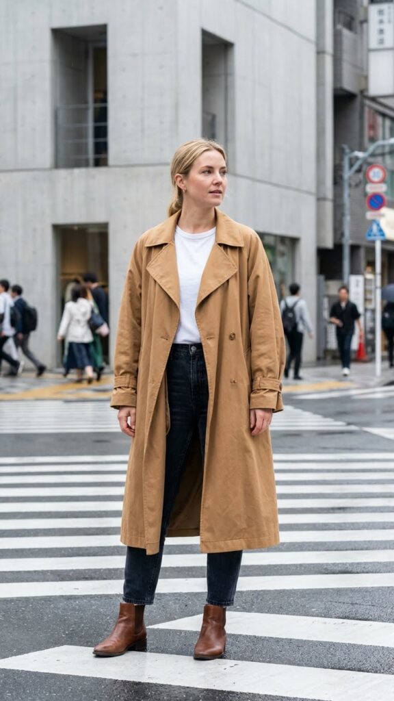 A classic trench coat is the Tokyo girl’s secret weapon, and you can throw it over literally any outfit to instantly look more polished. Wear it over jeans and a tee, over a dress, over wide-leg pants and a sweater. The oversized trench especially works because it adds drama and structure.