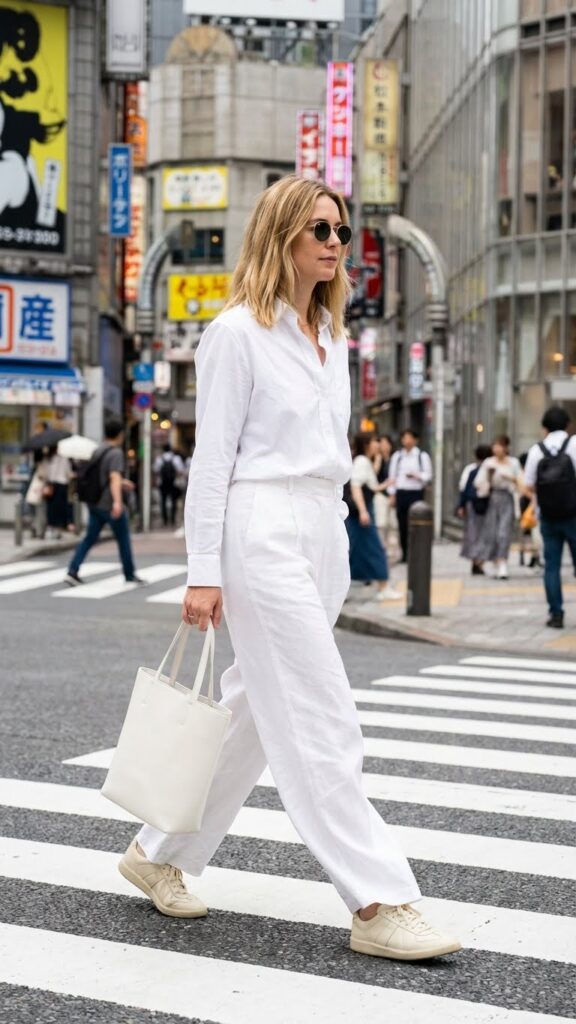 Add texture through different fabrics like denim, linen, or cotton to keep it from looking flat. Accessorize with a pop of color in your bag or shoes if you want, or commit fully to the white-out with cream-colored sneakers. This outfit will make you look like you have your entire life together, even if you’re just trying to figure out which train line to take. Fair warning though, avoid this look if you’re planning to eat ramen or anything with soy sauce. One splash and the dream is over.