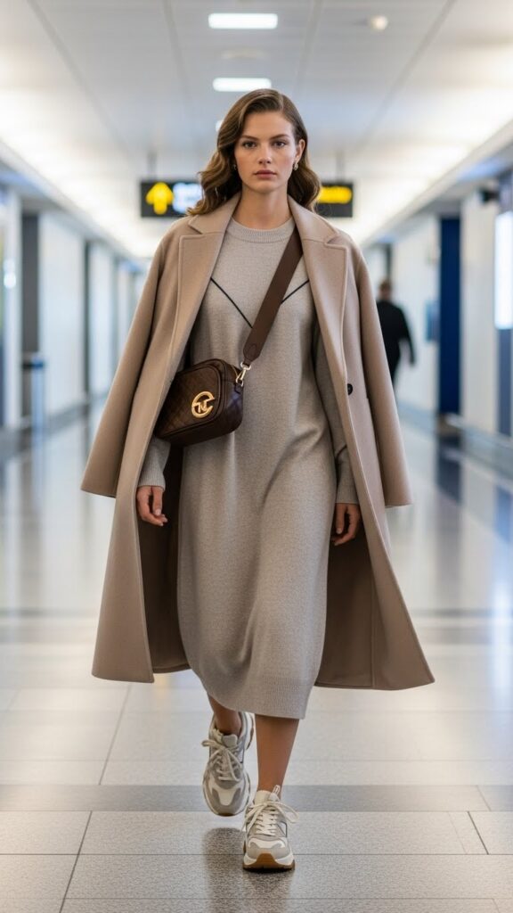 The sweater dress works because it’s essentially socially acceptable loungewear. You feel like you’re wearing a blanket, but everyone else sees a cute, put-together outfit. It’s the perfect travel illusion, and people are here for it.