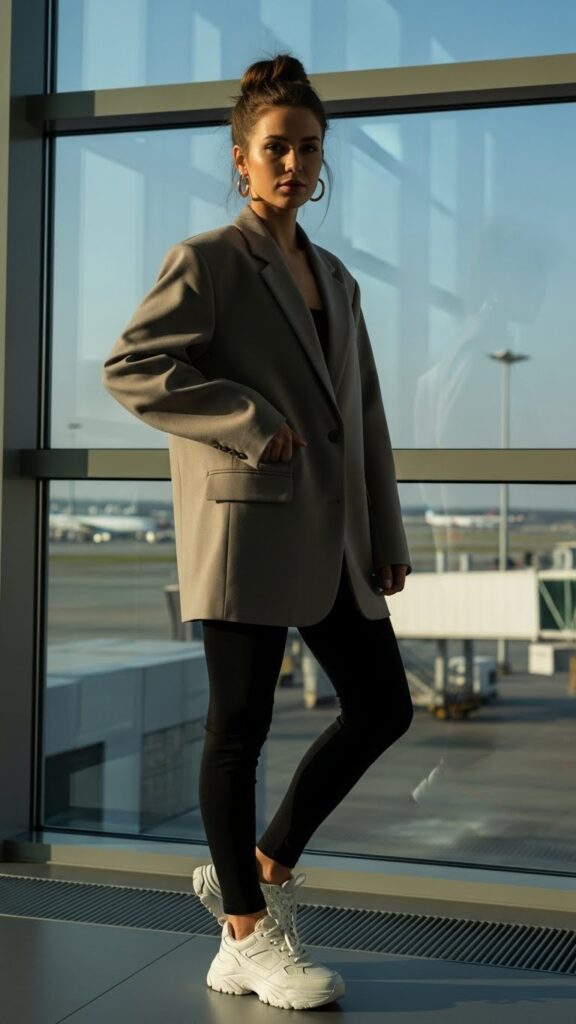 Nothing says “I’m casual but also have a meeting at 3pm” quite like an oversized blazer paired with leggings. This combo is chef’s kiss for airport vibes because it straddles that perfect line between polished and comfortable.