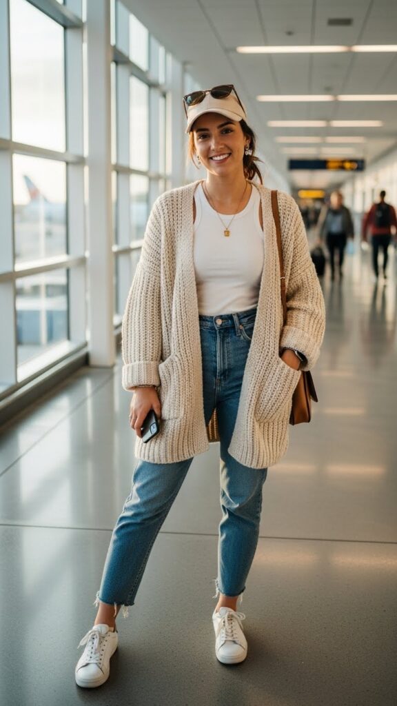The magic here is in the proportions. If your cardigan is oversized, keep everything else relatively fitted so you don’t look swallowed by fabric. Add a baseball cap and some dainty jewelry, and you’ve nailed that “effortlessly cool traveler” aesthetic everyone’s after.
